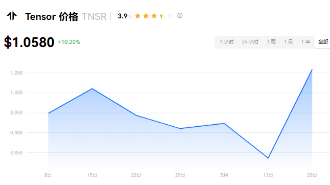 Tensor 当前价格为 $1.0580。Tensor 的价格在过去 24 小时内上涨了 10.21%。目前,Tensor 市值排名为第 183 名,实时市值为 $1.34亿,流通供应量为 125,000,000 TNSR,**供应量为 1,000,000,000 TNSR。我们会实时更新 Tensor/USD 的价格。Tensor 价格表现 (美元)