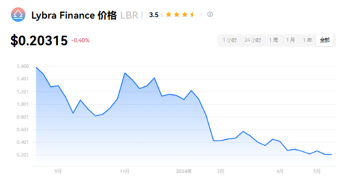 Lybra Finance 当前价格为 $0.20315。Lybra Finance 的价格在过去 24 小时内下跌了 -0.39%。目前,Lybra Finance 市值排名为第 266 名,实时市值为 $925.01万,流通供应量为 45,522,143 LBR,**供应量为 100,000,000 LBR。我们会实时更新 Lybra Finance/USD 的价格。Lybra Finance 价格表现 (美元)