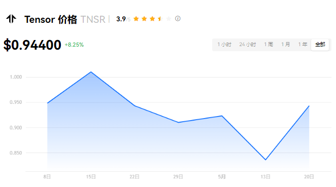 Tensor 当前价格为 $0.94400。Tensor 的价格在过去 24 小时内上涨了 8.26%。目前,Tensor 市值排名为第 188 名,实时市值为 $1.18亿,流通供应量为 125,000,000 TNSR,**供应量为 1,000,000,000 TNSR。我们会实时更新 Tensor/USD 的价格。Tensor 价格表现 (美元)