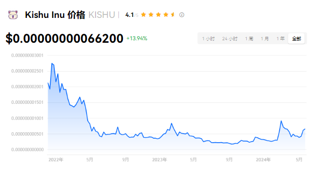 Kishu Inu 当前价格为 $0.00000000066200。Kishu Inu 的价格在过去 24 小时内上涨了 13.94%。目前,Kishu Inu 市值排名为第 219 名,实时市值为 $6,371.74万,流通供应量为 96,834,929,602,284,640 KISHU,**供应量为 96,696,163,330,358,380 KISHU。我们会实时更新 Kishu Inu/USD 的价格。Kishu Inu 价格表现 (美元)