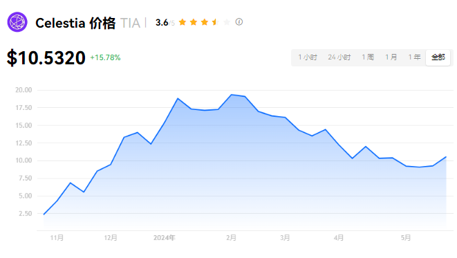 Celestia 当前价格为 $10.5320。Celestia 的价格在过去 24 小时内上涨了 15.79%。目前,Celestia 市值排名为第 51 名,实时市值为 $19.74亿,流通供应量为 186,851,747 TIA,**供应量为 1,045,808,219 TIA。我们会实时更新 Celestia/USD 的价格。Celestia 价格表现 (美元)