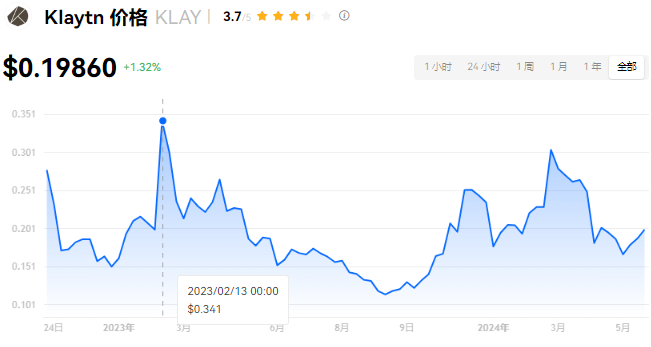 Klaytn 当前价格为 $0.19860。Klaytn 的价格在过去 24 小时内上涨了 1.33%。目前,Klaytn 市值排名为第 83 名,实时市值为 $7.34亿,流通供应量为 3,691,146,918 KLAY,**供应量为 5,955,231,679 KLAY。我们会实时更新 Klaytn/USD 的价格。Klaytn 价格表现 (美元)