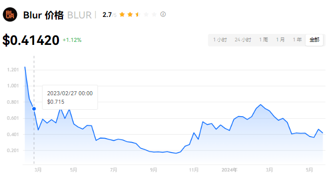 Blur 当前价格为 $0.41420。Blur 的价格在过去 24 小时内上涨了 1.12%。目前,Blur 市值排名为第 86 名,实时市值为 $6.81亿,流通供应量为 1,642,461,954 BLUR,**供应量为 3,000,000,000 BLUR。我们会实时更新 Blur/USD 的价格。Blur 价格表现 (美元)