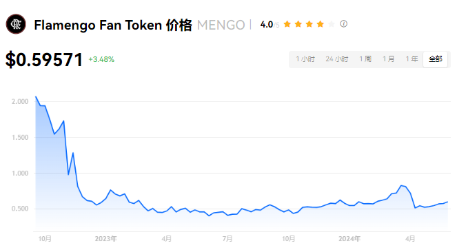 Flamengo Fan Token 当前价格为 $0.59571。Flamengo Fan Token 的价格在过去 24 小时内上涨了 3.49%。目前,Flamengo Fan Token 市值排名为第 257 名,实时市值为 $1,716.95万,流通供应量为 28,798,241 MENGO,**供应量为 30,000,000 MENGO。我们会实时更新 Flamengo Fan Token/USD 的价格。Flamengo Fan Token 价格表现 (美元)