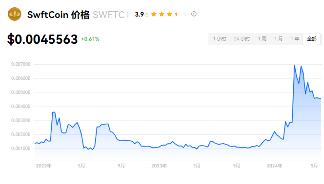 SwftCoin 当前价格为 $0.0045563。SwftCoin 的价格在过去 24 小时内上涨了 0.62%。目前,SwftCoin 市值排名为第 234 名,实时市值为 $4,083.51万,流通供应量为 8,958,999,999 SWFTC,**供应量为 10,000,000,000 SWFTC。我们会实时更新 SwftCoin/USD 的价格。SwftCoin 价格表现 (美元)