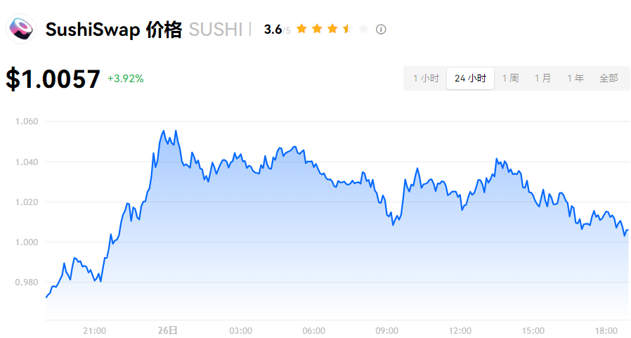 SushiSwap 当前价格为 $1.0057。SushiSwap 的价格在过去 24 小时内上涨了 3.93%。目前,SushiSwap 市值排名为第 156 名,实时市值为 $1.93亿,流通供应量为 192,789,256 SUSHI,**供应量为 250,000,000 SUSHI。我们会实时更新 SushiSwap/USD 的价格。SushiSwap 价格表现 (美元)
