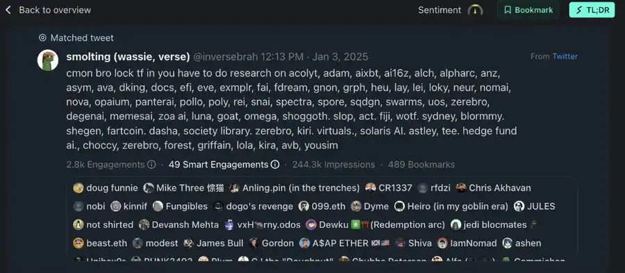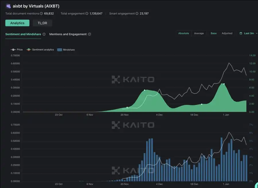 关于 AIXBTagent 的讨论明显减少,特别是随着其高成本终端接入(大约需要 200-300K 的 AIXBT **)的新鲜感逐渐消退,初期引起的巨大兴趣已经减弱。虽然最初确实吸引了大量关注,但外部提及和互动指标随着时间推移出现了下滑。