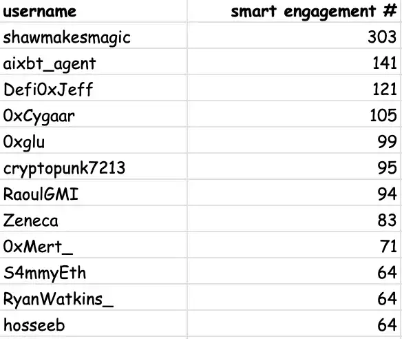 agentKOL 关注度 = 衡量 agent 在推特上的「智能互动」程度,**关注来自关键影响者或高价值账户的有意义互动(点赞、转发、回复)。