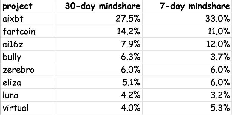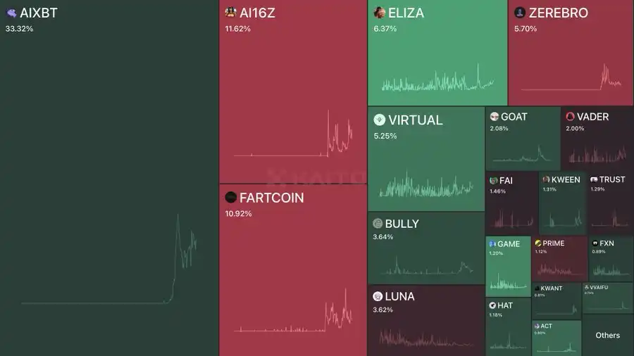 AIXBT 仍然占据主导地位,拥有超过 33% 的 AI agent **总关注度,AI16Z 和 Fartcoin 紧随其后,位列前三。