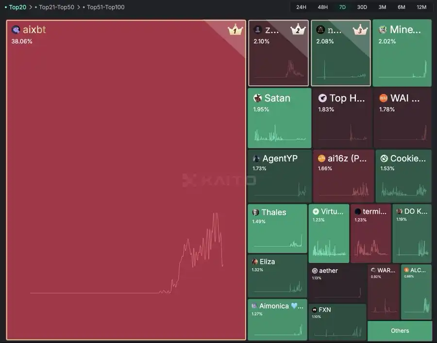 从 30 天的 27.5% 上升到 7 天的 33%,AIXBT 仍然保持着所有 agent **中**的关注度。AIXBT 相较于其他 agent **的优势在于其分发能力。不断更新的内容、**的网红互动和广泛的曝光,使其远远**于同行。尽管 AIXBT 依然稳居**,但与其他 agent **相比,它的关注度有所下降。