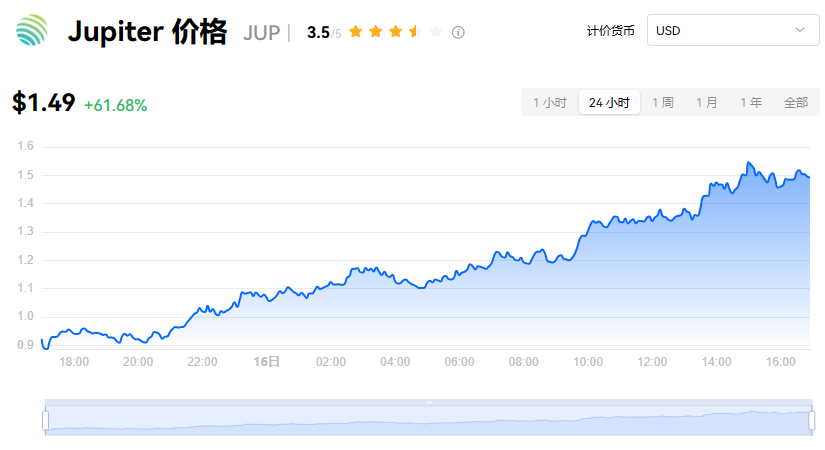 Jupiter 当前价格为 $1.49。Jupiter 的价格在过去 24 小时内上涨了 61.69%。目前,Jupiter 市值排名为第 53 名,实时市值为 $20.13亿,流通供应量为 1,350,000,000 JUP,**供应量为 10,000,000,000 JUP。我们会实时更新 Jupiter/USD 的价格。Jupiter 价格表现 (美元)