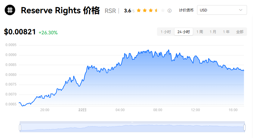 Reserve Rights 当前价格为 $0.00821。Reserve Rights 的价格在过去 24 小时内上涨了 26.31%。目前,Reserve Rights 市值排名为第 122 名,实时市值为 $4.18亿,流通供应量为 50,600,000,000 RSR,**供应量为 100,000,000,000 RSR。我们会实时更新 Reserve Rights/USD 的价格。Reserve Rights 价格表现 (美元)
