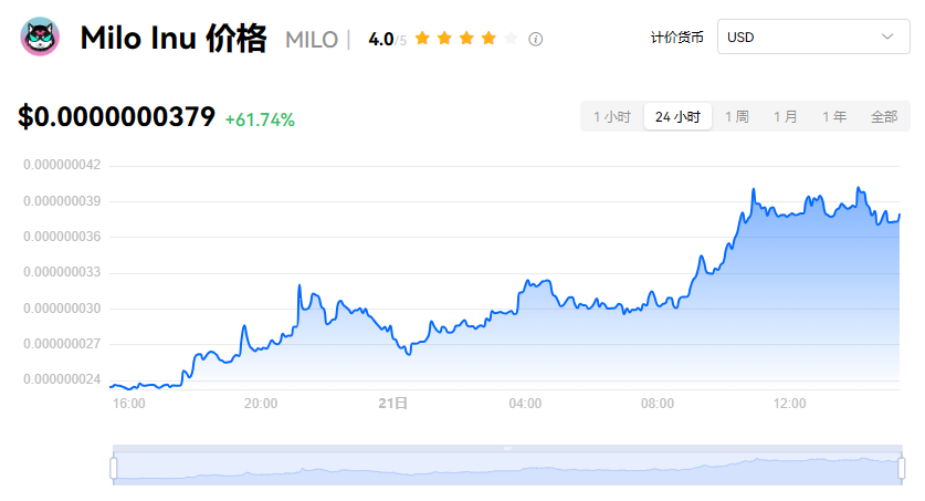Milo Inu 当前价格为 $0.0000000379。Milo Inu 的价格在过去 24 小时内上涨了 61.74%。目前,Milo Inu 市值排名为第 265 名,实时市值为 $1,131.61万,流通供应量为 296,700,000,000,000 MILO,**供应量为 690,000,000,000,000 MILO。我们会实时更新 Milo Inu/USD 的价格。