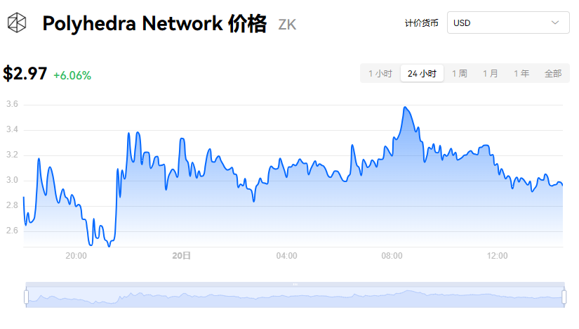 Polyhedra Network 当前价格为 $2.97。Polyhedra Network 的价格在过去 24 小时内上涨了 6.06%。目前,Polyhedra Network 市值排名为第 0 名,实时市值为 $0.00,流通供应量为 0 ZK,**供应量为 900,000,000 ZK。我们会实时更新 Polyhedra Network/USD 的价格。Polyhedra Network 价格表现 (美元)