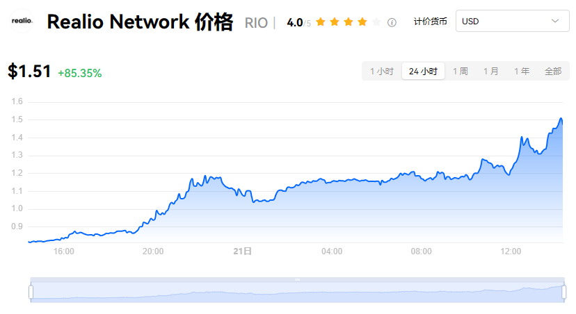 24 小时**/**价24 小时**$0.811 **价格 $1.51 24 小时**$1.52 热度排行 31 市值排行 210 市值 $8,381.58万 添加自选人数 (百分比) 1.04% 历史**价 $8.88 -83.03% (-$7.37) 2020年9月16日 (4 年前) 历史**价 $0.0132 11,320.70% ($1.49) 2022年10月13日 (2 年前) **发行时间 2020/09/16 **发行价 $0.400 流通总量 55,514,480 RIO 流通市值 $8,381.58万六、RIO近日消息