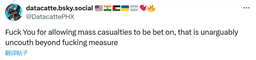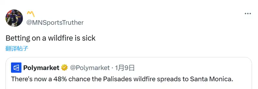 然而,许多网友对这些市场及 Polymarket 的宣传并不买账。一位 X 平台用户直言:「拿野火开赌实在是病态。」另一位用户表示,对这种悲剧进行**「无论如何都是令人难以接受的**行为。」