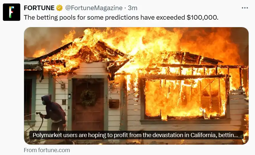 编者按:文章批评了预测市场平台 Polymarket 因用户对加州野火进行投机而引发的争议。在野火已造成多人死亡、数十万人撤离的背景下,用户冷漠押注灾情发展,部分预测资金池高达 10 万美元。这种将公共灾难「**化」的行为引发了强烈的道德质疑。