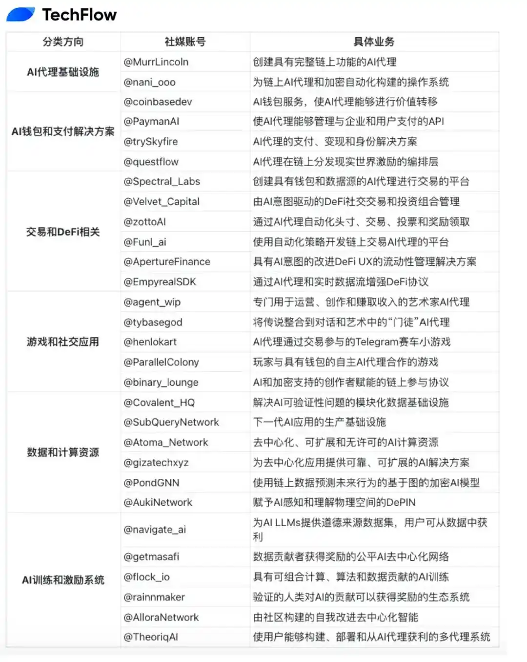 其他更多信息,可以借用知名博主 @sandraaleow 的一张图去对不同的方向进行分组和整合,了解当前 Base 生态中的 AI 项目们还在哪些方向上发展。