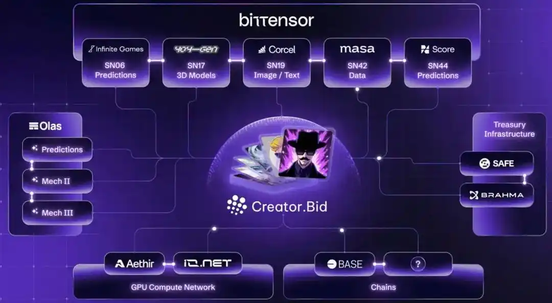 这其中,CreatorBid 必然是绕不过去的一环。它**的特点在于和 Bittensor 子网与 Olas 集成,为其生态系统带来了显著的实用性,特别是通过 Olas 即将推出的 Mech Marketplace。