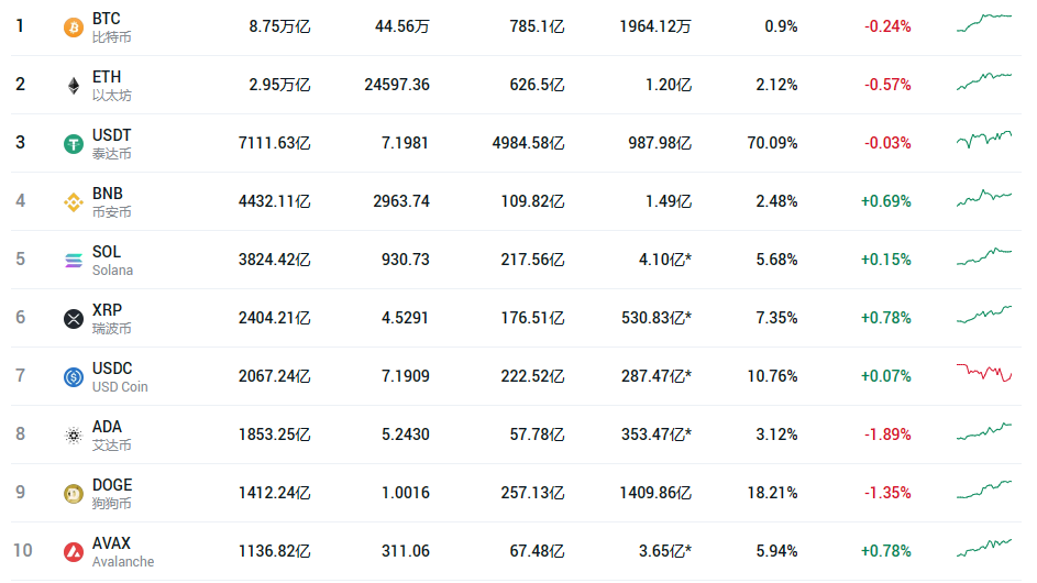 | 1 | ![]() BTC | 8.75万亿 | 44.56万 | 785.1亿 | 1964.12万 | 0.9% | -0.24% | |