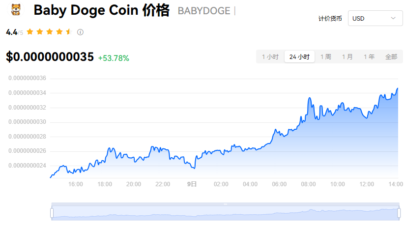 Baby Doge Coin 当前价格为 $0.0000000035。Baby Doge Coin 的价格在过去 24 小时内上涨了 53.78%。目前,Baby Doge Coin 市值排名为第 108 名,实时市值为 $5.05亿,流通供应量为 1,463,309,916.40亿 BABYDOGE,**供应量为 4,200,000,000.00亿 BABYDOGE。我们会实时更新 Baby Doge Coin/USD 的价格。