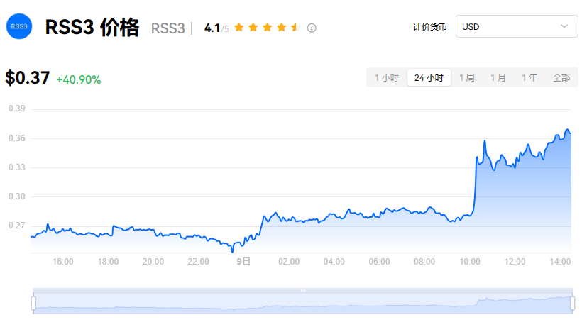 RSS3 当前价格为 $0.37。RSS3 的价格在过去 24 小时内上涨了 40.90%。目前,RSS3 市值排名为第 161 名,实时市值为 $2.30亿,流通供应量为 6.29亿 RSS3,**供应量为 10.00亿 RSS3。我们会实时更新 RSS3/USD 的价格。RSS3 价格表现 (美元)