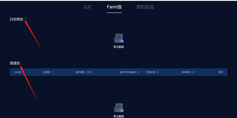 1、Farm池有三个Tab,头矿、Farm池和Dashboard。Farm tab展示所有Farm池,包括白名单Farm池和非白名单池。用户可以在这里浏览Farm池质押金额,挖矿速率和年化收益率。当池子开启挖矿时您就可以链接钱包对池子进行质押操作获得收益。