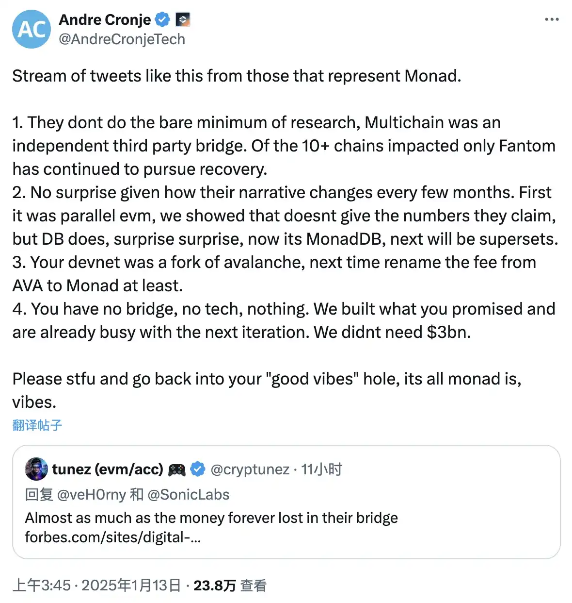 但随后不久,Monad 方面负责增长业务的团队核心成员 tunez 却突然跳出来「嘴欠」了一句:「这几乎和他们在跨链桥中丢的钱一样多。」