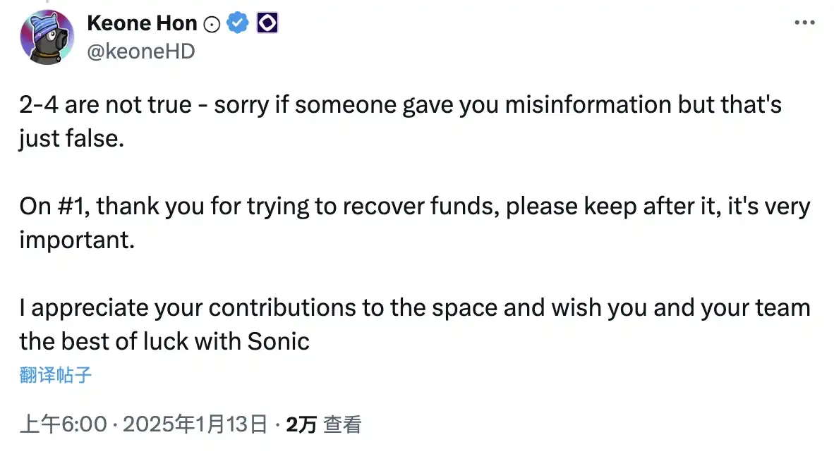 Keone Hon 先是否认了 AC 第 2-4 点关于 Monad 的批评,并强调此类传言均不正确。同时,Keone Hon 还赞扬了 Sonic 继续尝试追赃的行为以及 AC 对行业的贡献,**还祝福了 AC 及 Sonic 的未来发展。