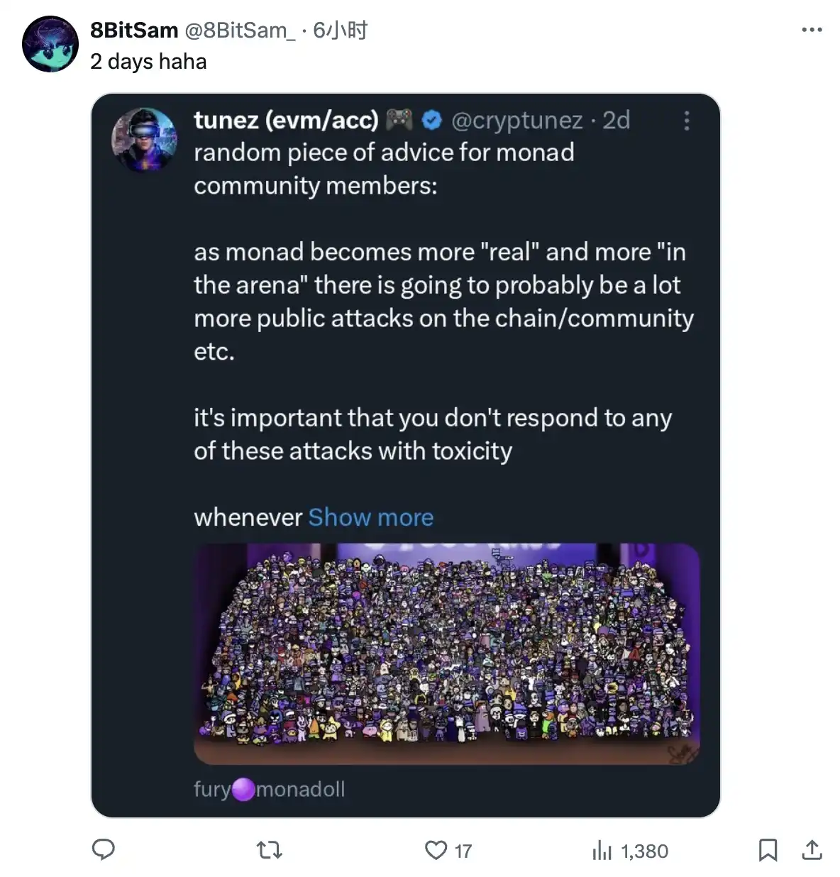 多位 Sonic 社区成员纷纷开始了对 tunez 的回击,有人还翻出了 tunez 两天前说过的话「随着 Monad 越来越受欢迎,也将会遭受越来越多的攻击」,言辞直指 tunez 此举是受到了 Sonic 热度的**。
