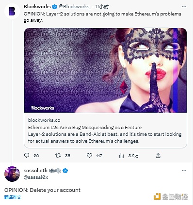 4月21日消息,Blockworks今日发表了一篇题为《以太坊L2是一个伪装成功能的漏洞》的文章,称Layer-2技术实际上在做的是为以太坊上的一些特定问题贴上创可贴,但实际上并没有创建解决以太坊**实际问题的解决方案。以太坊的问题不在于存在gas费这一事实,而是gas费太高。L2通过为用户提供一个发送他们的交易的场所然后可以将这些交易的结果广播到主网,而不是用主网来实现这一点。将L2识别为不充分的权宜之计的观念转变可能会鼓励社区优先寻找和开发长期解决方案以应对以太坊的挑战,这可能会导致更多创新和可持续技术的出现。对此,EthHub联合创始人sassal.eth对此评论称“建议删除你的推特账户”,部分用户亦对此篇文章表示质疑。