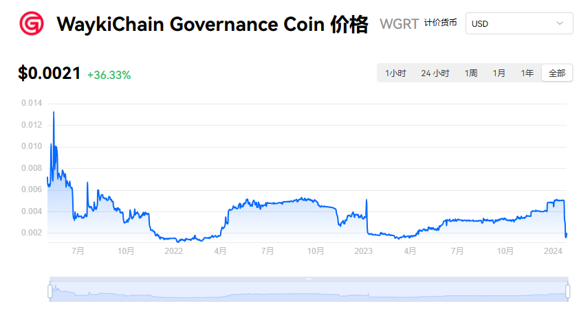 WaykiChain Governance Coin 当前价格为 $0.0021。WaykiChain Governance Coin 的价格在过去 24 小时内上涨了 36.33%。目前,WaykiChain Governance Coin 市值排名为第 -- 名,实时市值为 $0.00,流通供应量为 0.00 WGRT,**供应量为 210.00亿 WGRT。我们会实时更新 WaykiChain Governance Coin/USD 的价格。