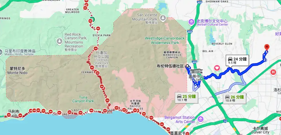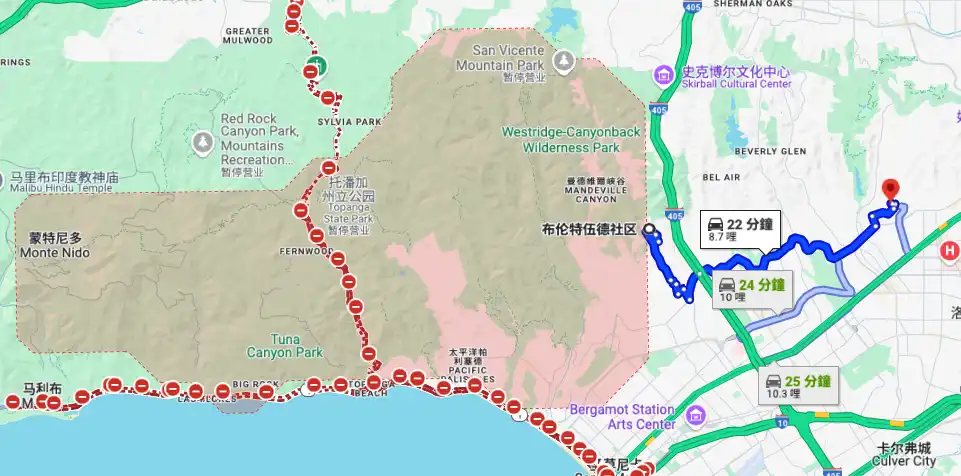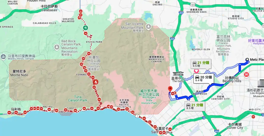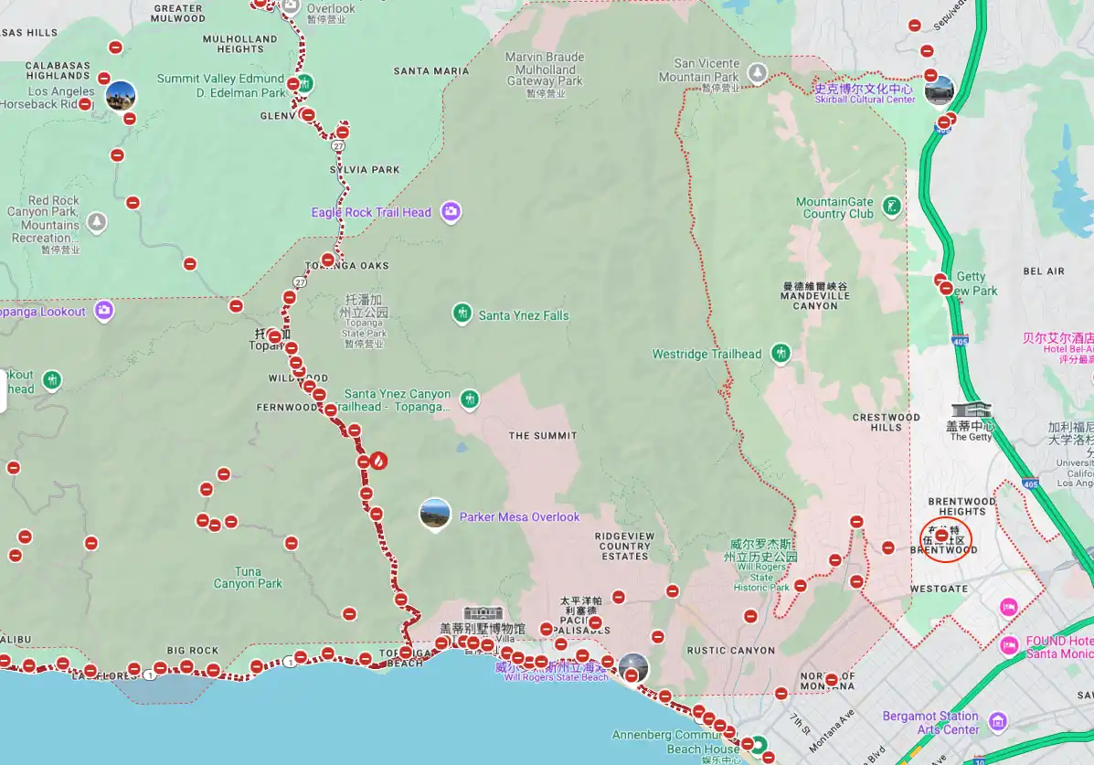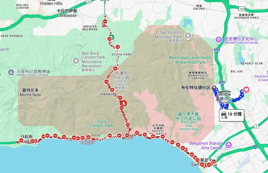这座豪宅的地理位置使其距离最近的山火区 Palisades ** 16 公里,这对居住安全构成潜在风险。