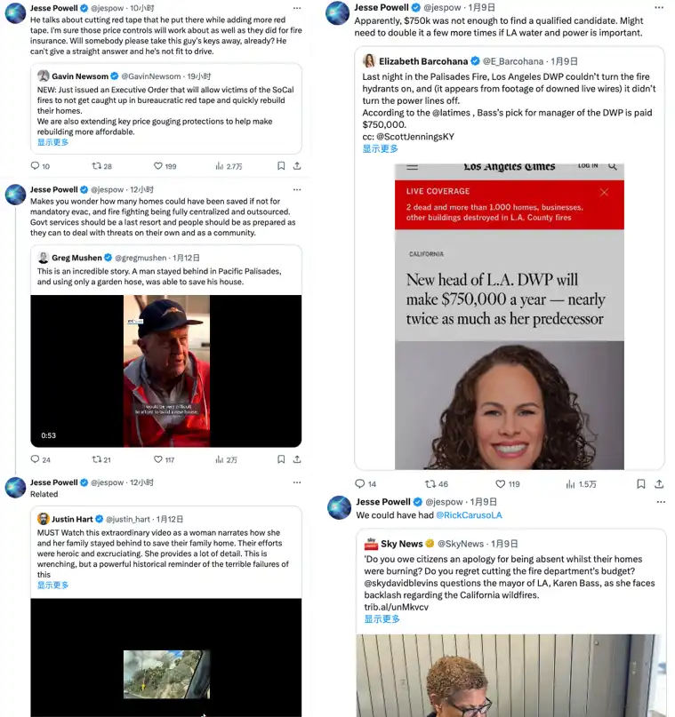 Jesse Powell 似乎也是最关心火情的币圈人之一,翻看他最近的几条推特,基本都是批判政府在火情控制上的糟糕表现以及受灾群众的情况,表现出了他对当前情况的关注和焦虑。因此我们猜测,在被 FBI 搜查后的几年里,Jesse Powell 似乎并没有出售这一套在洛杉矶的房产,且该房产正处于危险当中。