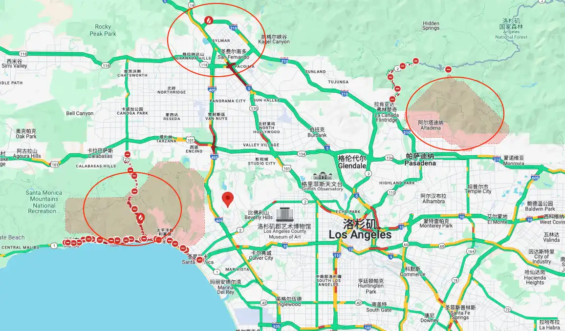 火灾影响**的城市 Pacific Palisades,75% 的房子都被夷为了平地;新一轮季节性强风来袭,助推山火向东蔓延开来;除了 Palisades 外,洛杉矶目前还有另外两处野火区域,周围居民面临着严峻的考验。