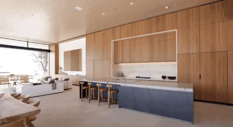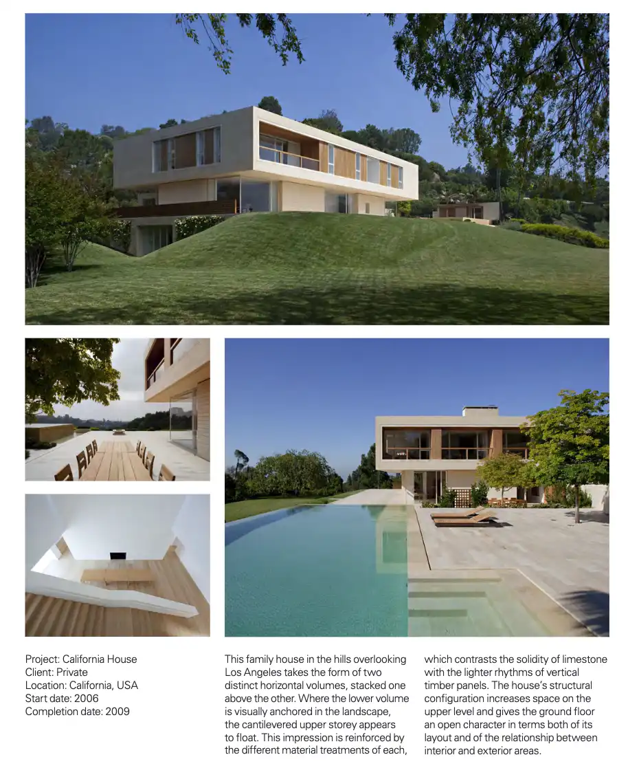 这座别墅的设计由备受尊敬的英国建筑师 John Pawson 操刀,以其标志性的极简主义美学著称。别墅的设计采用了「堆叠立方体」的结构,大面积的玻璃墙和简约的内部装潢配以宽敞的橡木家具,营造出一种现代而舒适的居住环境。