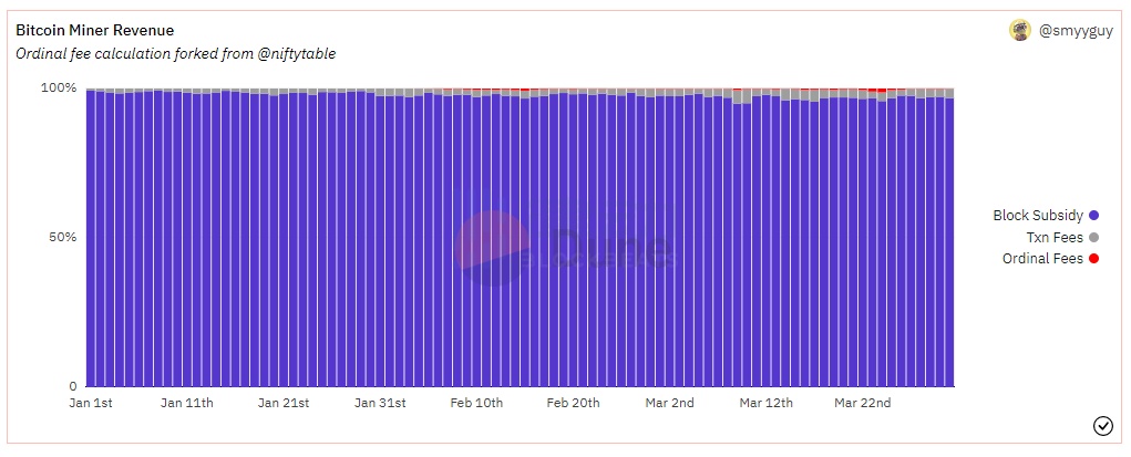 根据 @**yyguy 的数据, 3 月份只有 0.3% 的矿工收入来自 Ordinals 协议。Ordinals 协议还很年轻,天知道会不会真的发展到影响比特币网络的运行,又哪能知道届时的影响是好是坏...