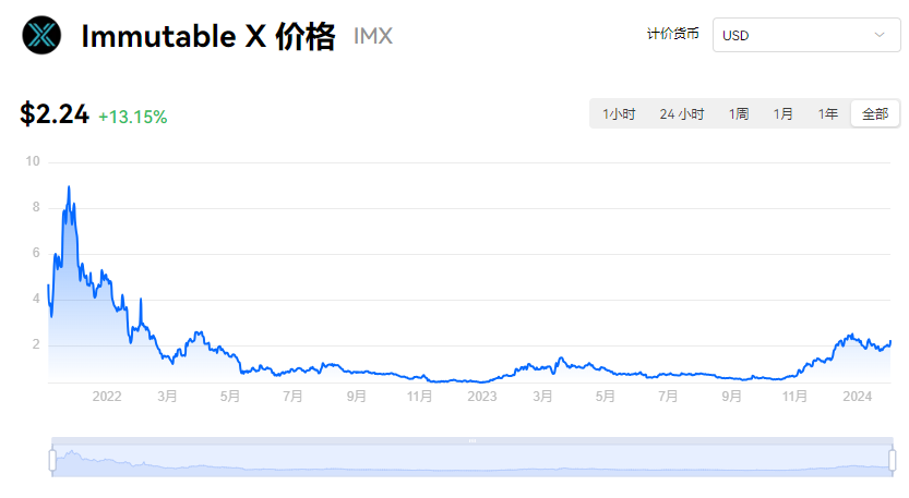 Immutable X 当前价格为 $2.24。Immutable X 的价格在过去 24 小时内上涨了 13.15%。目前,Immutable X 市值排名为第 -- 名,实时市值为 $20.34亿,流通供应量为 9.15亿 IMX,**供应量为 --。我们会实时更新 Immutable X/USD 的价格。Immutable X 价格表现 (美元)