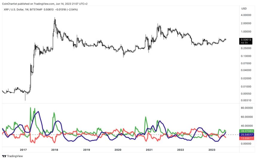 XRP 仍处于与美国证券交易委员会的法律纠纷的**,但技术面可能指向此案的积极结果。这是根据平均方向指数得出的,该指数在每周时间框架内显示出增强的看涨趋势。