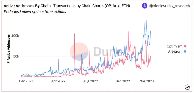 除了公链收入以外,我们再来看看Arbitrum上的每日交易笔数与活跃地址数的对比,如下Dune面板所示,过去三个月里Arbitrum生态中的交易笔数远大于Optimi**,Arbitrum上的交易笔数约为OP的2-3x,其中有其生态中的爆火游戏Beacon的影响,也有GMX这类Top级协议的带动。