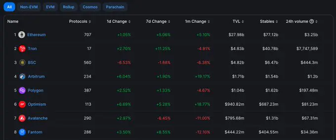 从下图Defillama的排行中我们可以看出,目前Arbitrum上的协议数量为234个,Optimi**上的为113个,是OP生态的两倍,过去一个月两者的TVL都上涨了近20%,没有显著差别;而从TVL来看,Arbitrium上的TVL目前为$1.71b,OP为$0.94B,前者是后者的1.82倍。