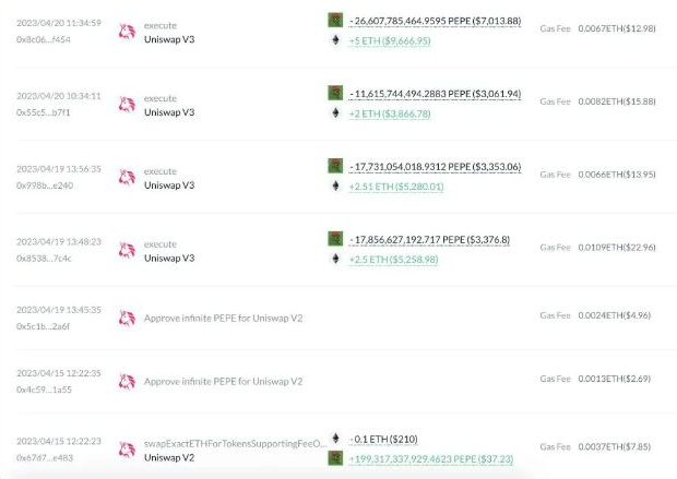 除了参与最初的青蛙主题币之外,投资者还抓住机会投资了PEPE 2.0。PEPE 2.0推出后,投资者以0.1 ETH迅速购买了3.88万亿**。仅仅一小时后,他们就采取了战略行动,出售了 1.78 万亿枚**,赚取了 37 ETH 的丰厚回报。