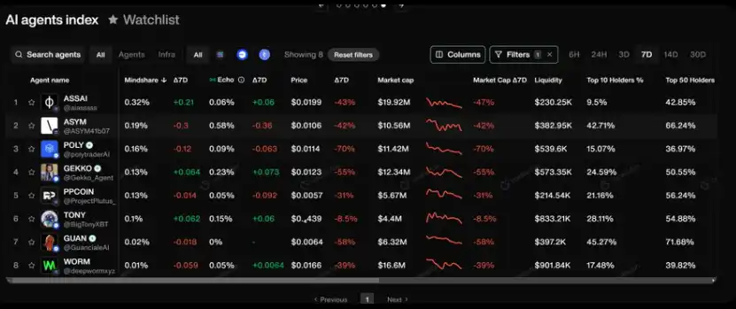 自动化交易代理类别正经历大幅回撤,其中 TONY 仅下跌了 8%,在过去 7 天表现**。