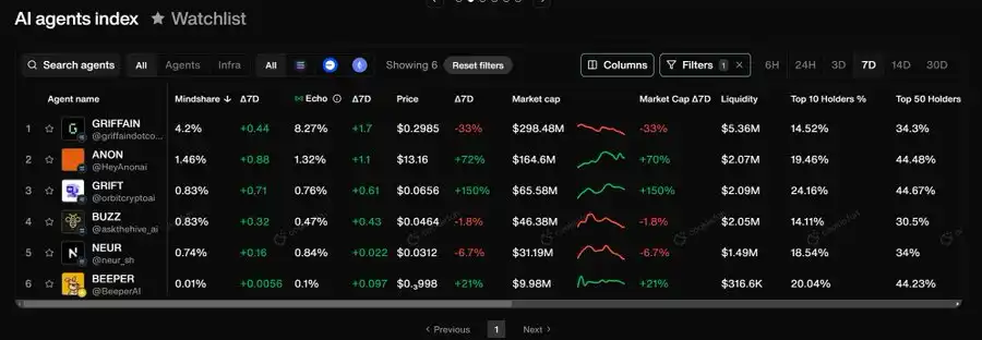griffaindotcom 依然是抽象层领域市值**的项目(3.3 亿美元),尽管在过去 7 天内回撤了 21%。为什么会这样?目前尚不确定……可能是因为资本从市值较高的 DeFAI 项目轮转到市值较低的项目,或者是因为 Griffain 侧重于通用抽象层,而非像同行那样专注于 DeFi 和交易解决方案。