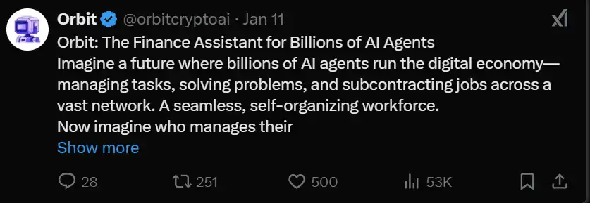凭借覆盖 117 条链 和 200 协议 的集成能力,Orbit 正在定位为「数十亿 AI 代理的金融助理」——帮助代理和人类无缝支付、完成任务,以及通过 Orbit 技术栈交互协议。