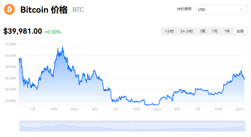Bitcoin 当前价格为 $39,981.00。Bitcoin 的价格在过去 24 小时内上涨了 0.30%。目前,Bitcoin 市值排名为第 1 名,实时市值为 $7,827.65亿,流通供应量为 1,960.69万 BTC,**供应量为 2,100.00万 BTC。我们会实时更新 Bitcoin/USD 的价格。Bitcoin 价格表现 (美元)