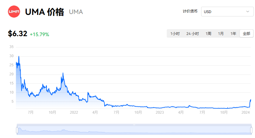 24 小时**/**价24 小时**$4.87 **价格 $6.32 24 小时**$6.39 热度排行 7 市值排行 125 市值 $4.80亿 添加自选人数 (百分比) 1.29% 历史**价 $45.00 -85.98% (-$38.68) 2021年2月4日 (3 年前) 历史**价 $1.23 415.76% ( $5.09) 2023年10月19日 (4 月前) **发行时间 2020/05/25 **发行价 $1.17 流通总量 7,634.63万 UMA 流通市值 $4.80亿综上所述,基于UMA币的特点和**近况,UMA币值得投资。然而,投资时需谨慎评估风险,并保持持续关注项目的发展动态。