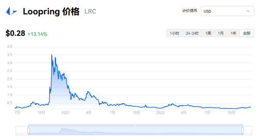 Loopring 当前价格为 $0.28。Loopring 的价格在过去 24 小时内上涨了 13.14%。目前,Loopring 市值排名为第 178 名,实时市值为 $3.33亿,流通供应量为 12.46亿 LRC,**供应量为 13.75亿 LRC。我们会实时更新 Loopring/USD 的价格。Loopring 价格表现 (美元)