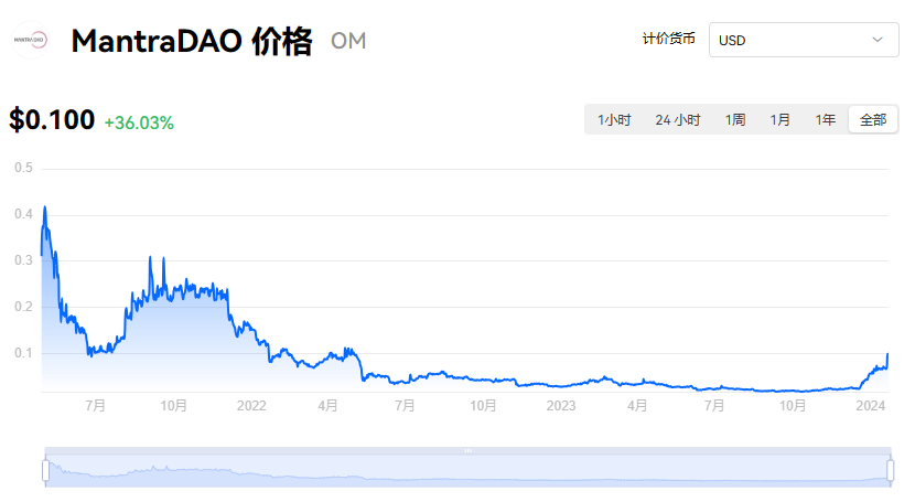 24 小时**/**价24 小时**$0.072 **价格 $0.100 24 小时**$0.13 热度排行 16 市值排行 426 市值 $7,896.64万 添加自选人数 (百分比) 0.51% 历史**价 $0.88 -88.74% (-$0.78) 2021年3月16日 (3 年前) 历史**价 $0.018 473.85% ( $0.082) 2023年10月12日 (4 月前) **发行时间 2020/08/18 **发行价 $0.20 流通总量 7.96亿 OM 流通市值 $7,896.64万五、相关行业信息