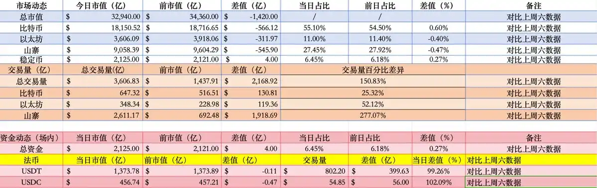 市场整体下跌,BTC 占比吸血 ETH 山寨,市场风险偏好加速下跌。